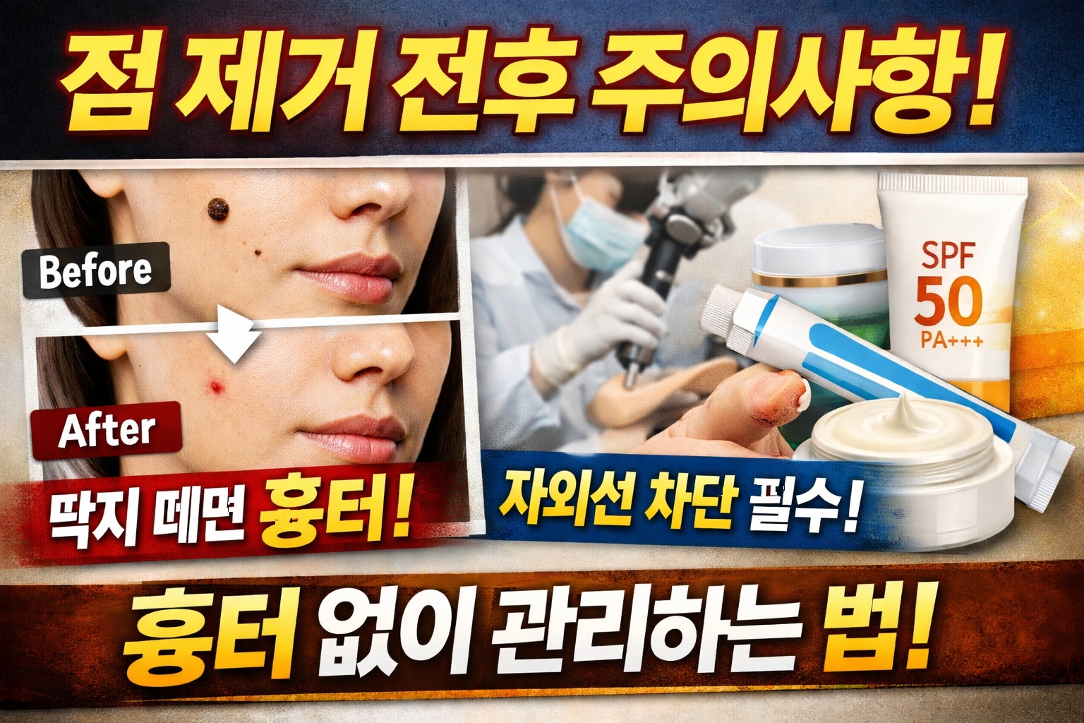 점 제거 전후 주의사항만 제대로 지켜도 흉터 없이 깨끗한 피부를 유지할 수 있습니다. 시술보다 중요한 것은 꾸준한 사후 관리라는 점을 꼭 기억하세요.