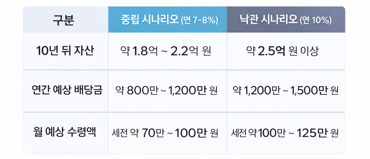 • 핵심: 첫 10년은 배당 재투자를 통해 자산의 덩어리를 키우고, 그 이후부터 현금 흐름을 생활비로 사용하는 전략이 가장 유효합니다.