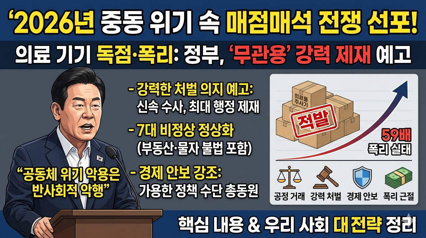 2026년 현재, 글로벌 경제는 중동 지역의 위기 고조로 인해 유례없는 불확실성에 직면해 있습니다. 이러한 혼란을 틈타 국민의 생명과 직결된 의료 기기를 독점하고 폭리를 취하는 이른바 '매점매석' 행위가 기승을 부리고 있습니다. 정부는 이에 대해 '폐가망신' 수준의 강력한 제재를 예고하며 전쟁을 선포했습니다. 이번 사태의 핵심 내용과 우리 사회가 나아가야 할 방향을 정리해 드립니다.
