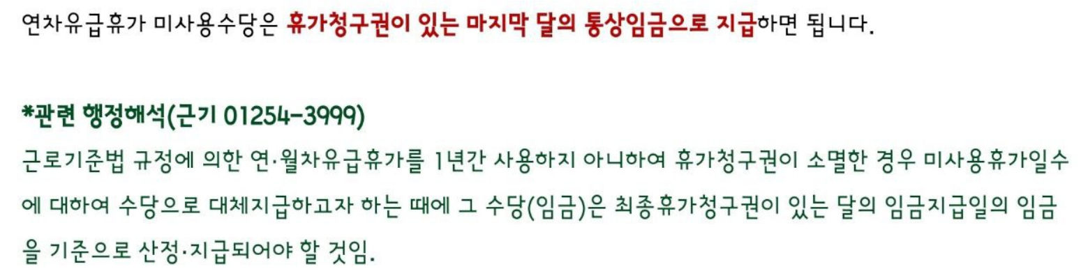 다만, 노동조합이 있는 경우 현재 통상임금 이슈로 노사간 쟁점이 되고 있고, 2025년 교섭에 영향이 있으므로 많은 기업들이 노동부 지침이 아직 없다는 이유로 판결이 반영되지 않은 12월 통상급여 기준으로 미사용 수당을 25년 1월에 지급할 예정인 업체들이 많은 상황이니 참고하시기 바랍니다.