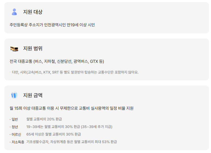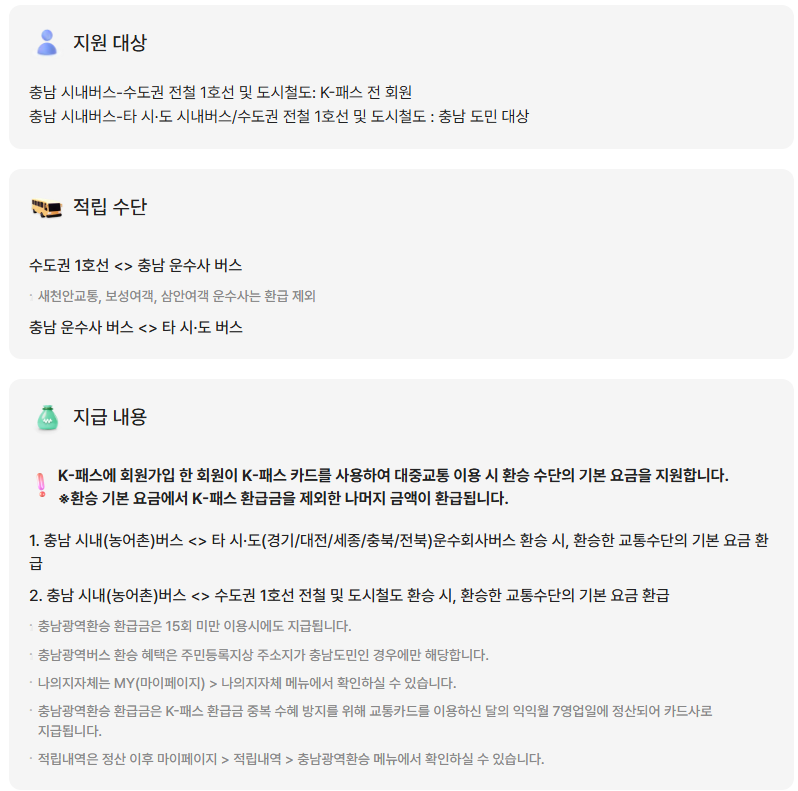 - 대중교통 적용 범위 : 시내버스, 광역버스, 지하철, 신분당선, GTX 등
