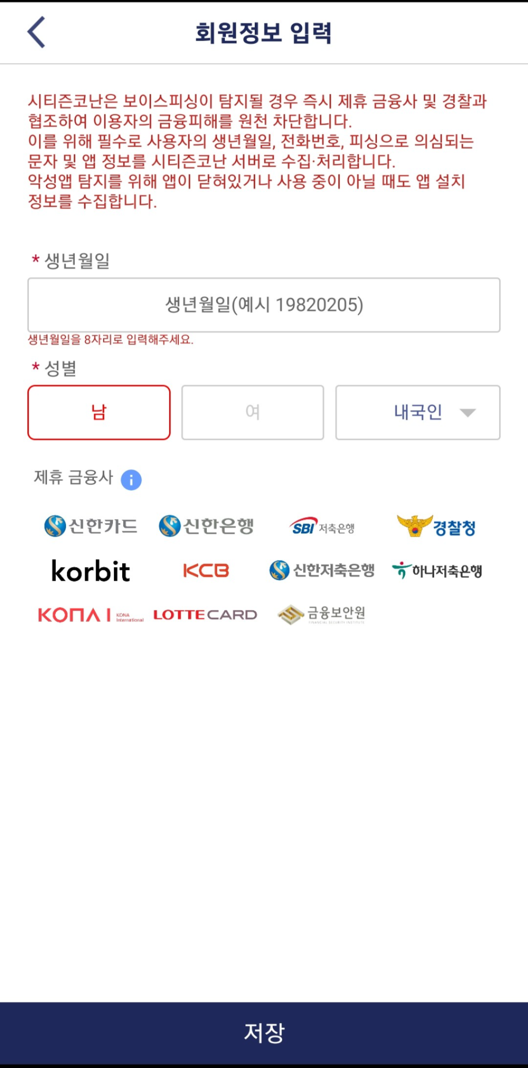 개인 정보를 입력할 때는 생년월일만 입력하면 됩니다. 이 정보는 보이스피싱 예방과 관련된 앱 분석에 도움을 주기 위한 최소한의 정보입니다. 성별 체크하고 아래 저장 버튼 누르시면 됩니다.