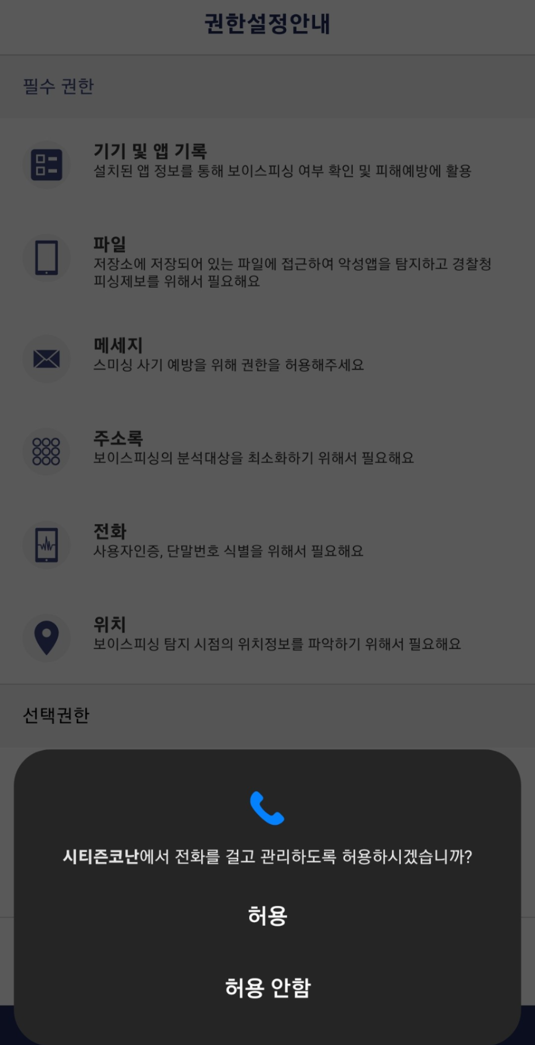 앱을 처음 실행하면 권한 설정이 요구됩니다. 이는 앱이 정상적으로 작동하기 위한 필수 설정입니다. 앱에서 요구하는 권한을 허용하고, 설정에서 악성 앱 탐지를 활성화합니다.